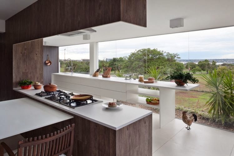 Fugindo do princípio que Cozinha não precisava ser bonita, apenas funcional, as cozinha de hoje estão cada vez mais integradas com o Ambiente Social da Casa, seja varanda, seja sala.